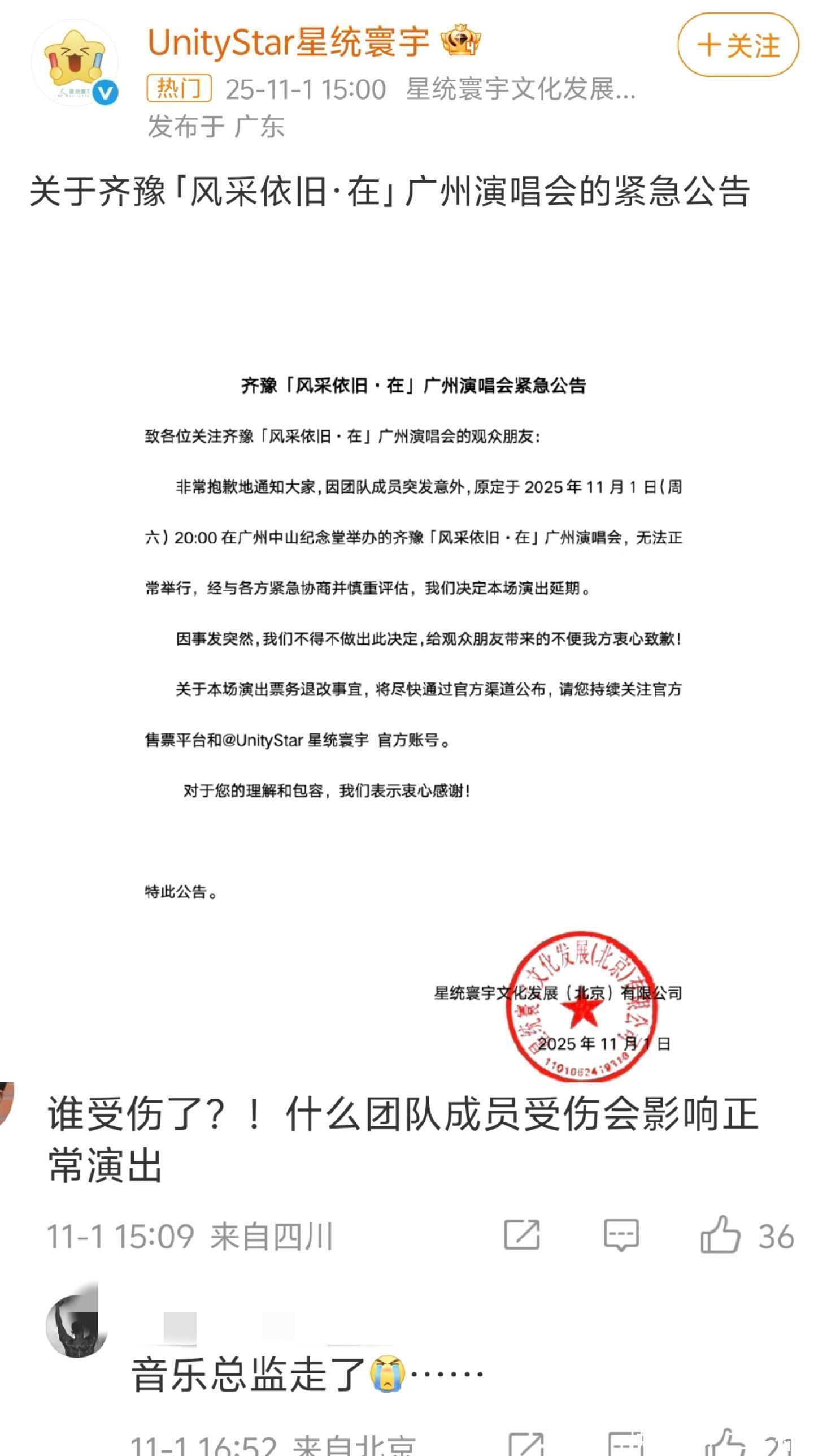 屠颖是齐豫巡回演唱会的音乐总监,因为他的离世,广州站演唱会在开场前五个小时通过主办方官宣延期