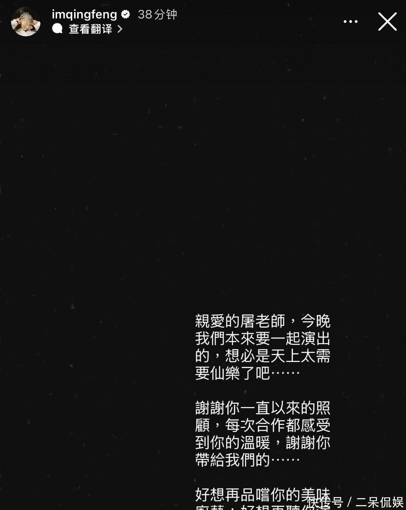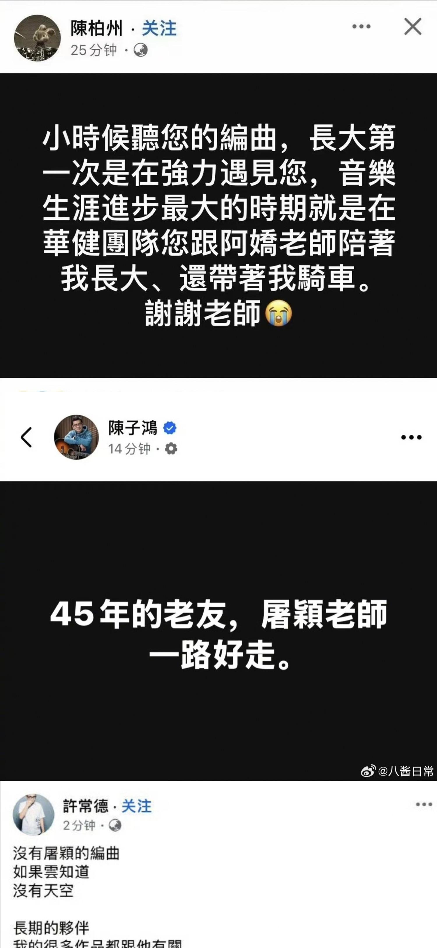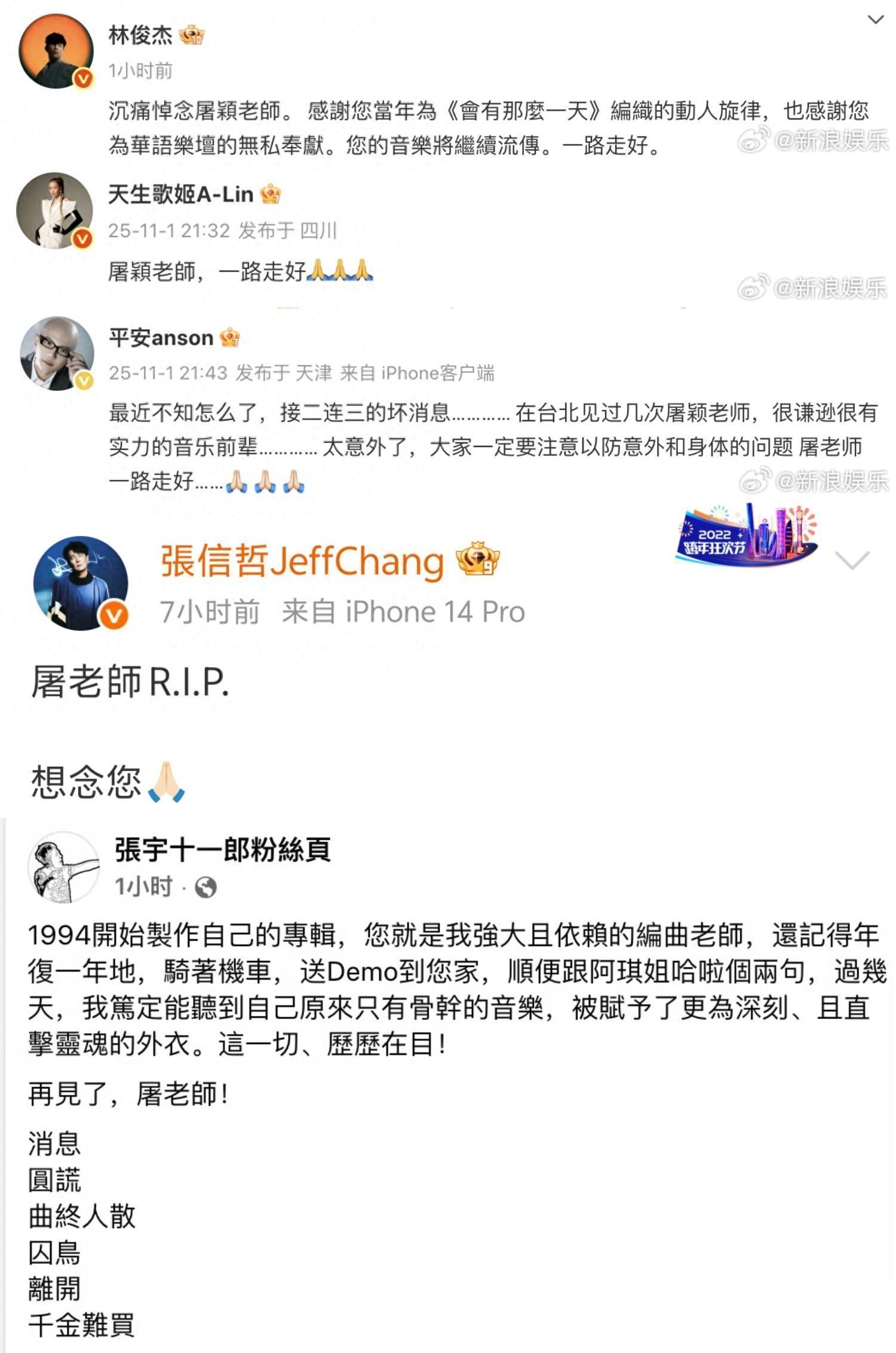 众星发文悼念屠颖:林俊杰张信哲ALin黄丽玲杨丞琳吴青峰张宇