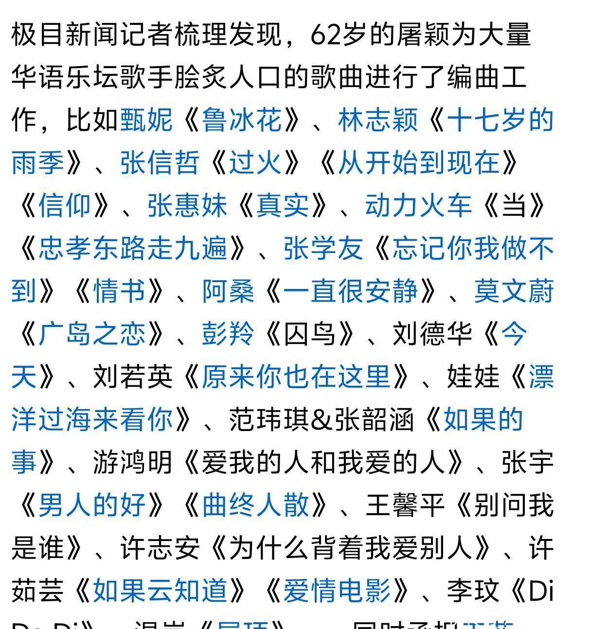 编曲是一首歌非常重要的环节,如果做的不好会大打折扣,影响歌曲质量和歌手发挥,看《歌手2025》一直被骂编曲差就知道了。屠颖的编曲占据了华语乐坛的半壁江山,从四大天王的刘德华、张学友,到天后王菲、张惠妹等,不是他们的爆火代表作就是成名曲,基本他参与的都家喻户晓、耳熟能详,好多歌一直变成经典流传至今。